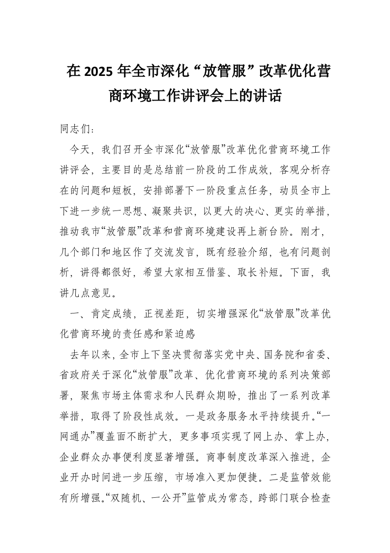 在2025年全市深化“放管服”改革优化营商环境工作讲评会上的讲话