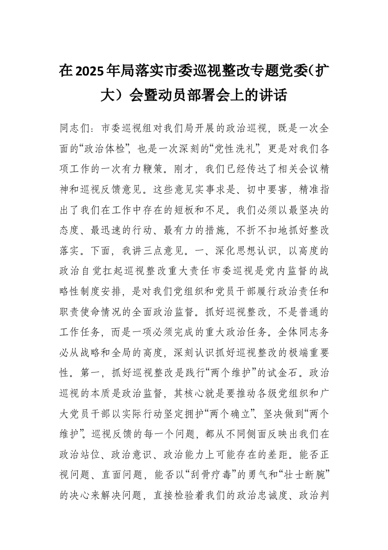 在2025年局落实市委巡视整改专题党委(扩大)会暨动员部署会上的讲话
