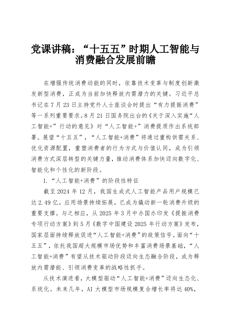 党课讲稿:“十五五”时期人工智能与消费融合发展前瞻