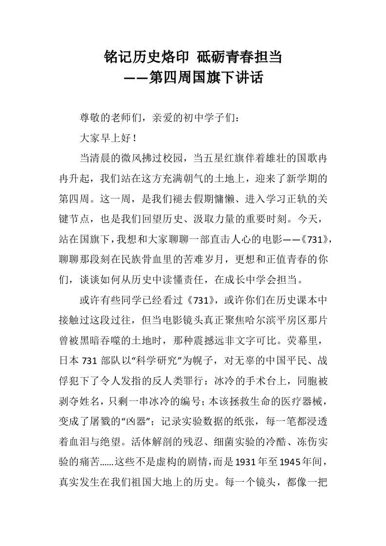 铭记历史烙印 砥砺青春担当——第四周国旗下讲话