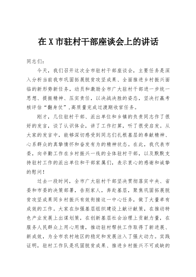 在X市驻村干部座谈会上的讲话