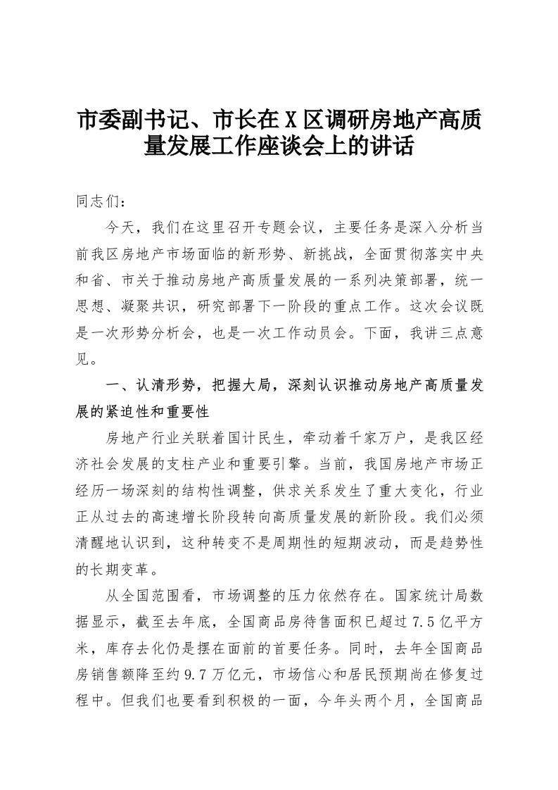 市委副书记、市长在X区调研房地产高质量发展工作座谈会上的讲话