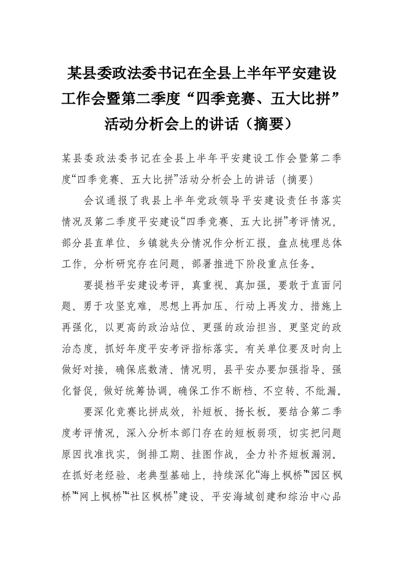 首页写作素材某县委政法委书记在全县上半年平安建设工作会暨第二季度“四季竞赛、五大比拼”活动分析会上的讲话(摘要)
