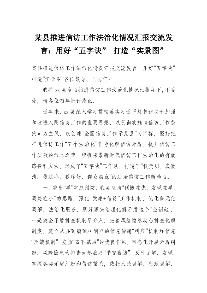 某县推进信访工作法治化情况汇报交流发言:用好“五字诀” 打造“实景图”