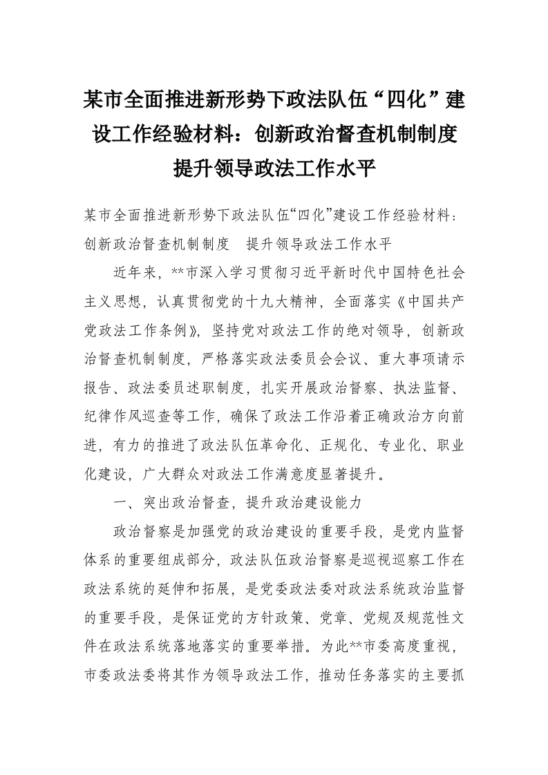 某市全面推进新形势下政法队伍“四化”建设工作经验材料:创新政治督查机制制度 提升领导政法工作水平