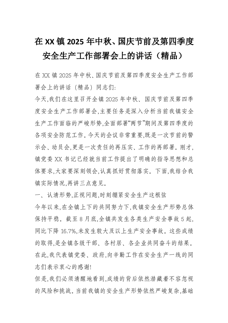 在XX镇2025年中秋、国庆节前及第四季度安全生产工作部署会上的讲话(精品)