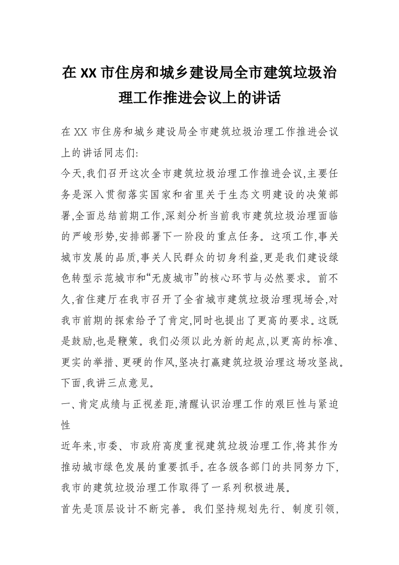 在XX市住房和城乡建设局全市建筑垃圾治理工作推进会议上的讲话