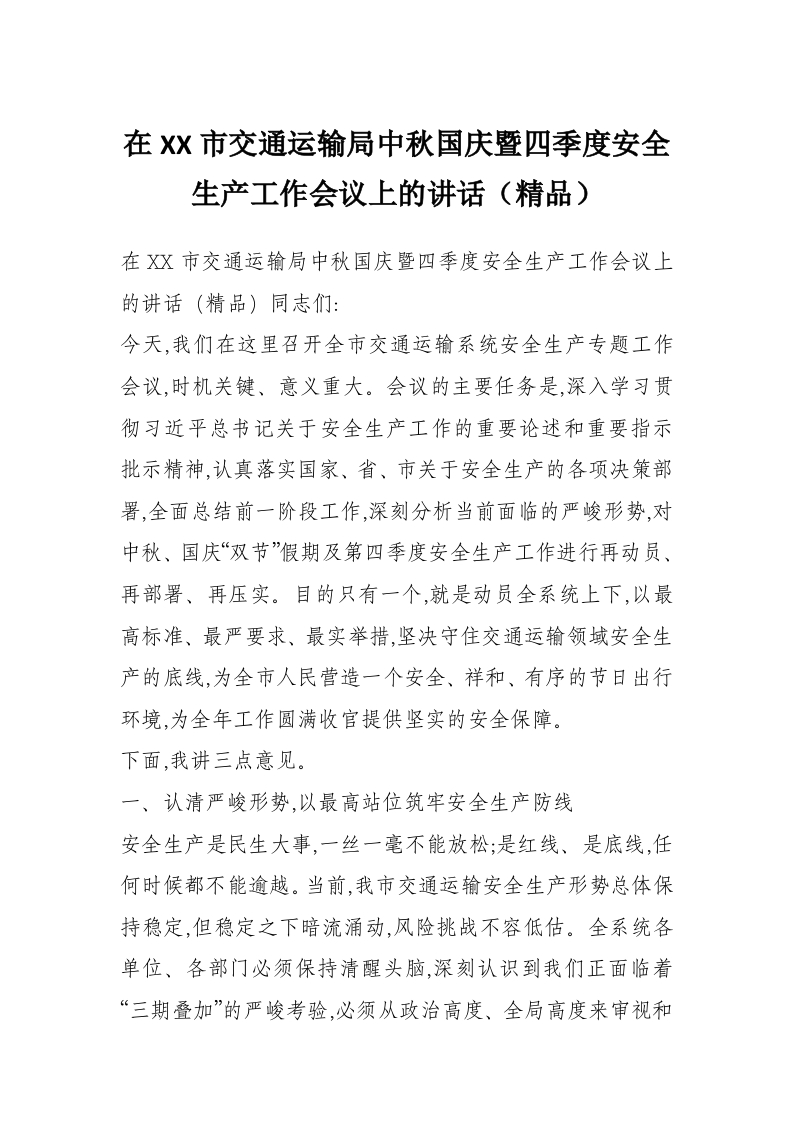 首页精选范文在XX市交通运输局中秋国庆暨四季度安全生产工作会议上的讲话(精品)