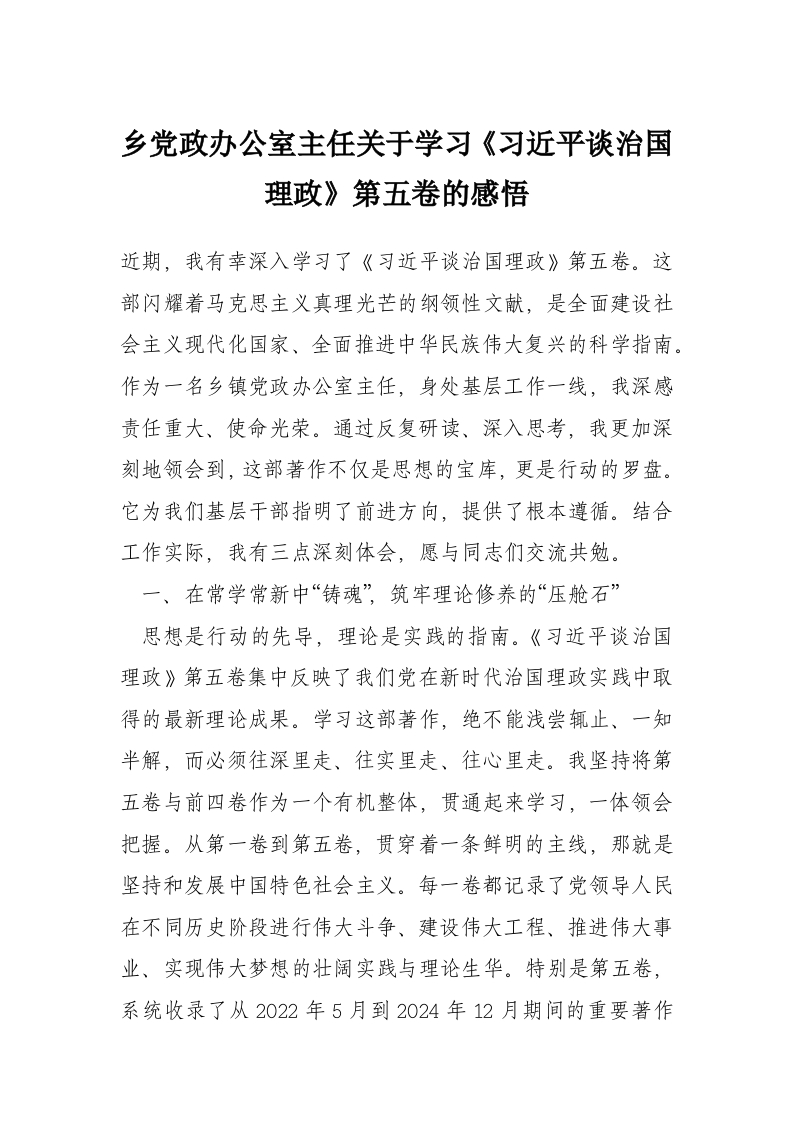 乡党政办公室主任关于学习《***谈治国理政》第五卷的感悟
