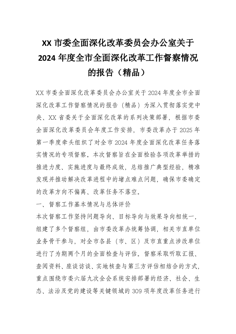XX市委全面深化改革委员会办公室关于2024年度全市全面深化改革工作督察情况的报告(精品)