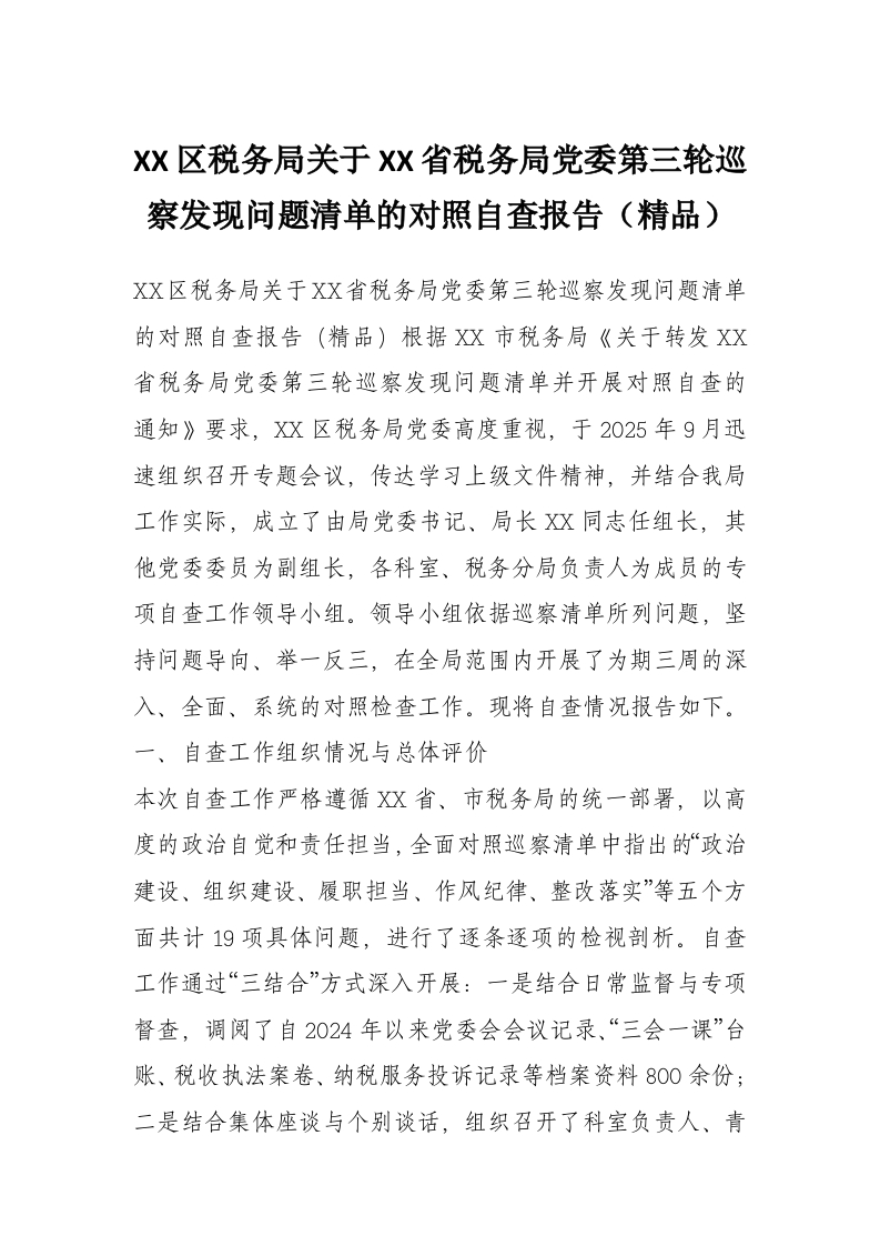 XX区税务局关于XX省税务局党委第三轮巡察发现问题清单的对照自查报告(精品)