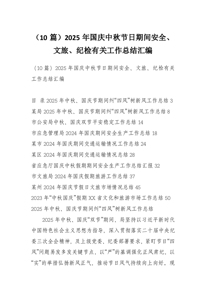 (10篇)2025年国庆中秋节日期间安全、文旅、纪检有关工作总结汇编