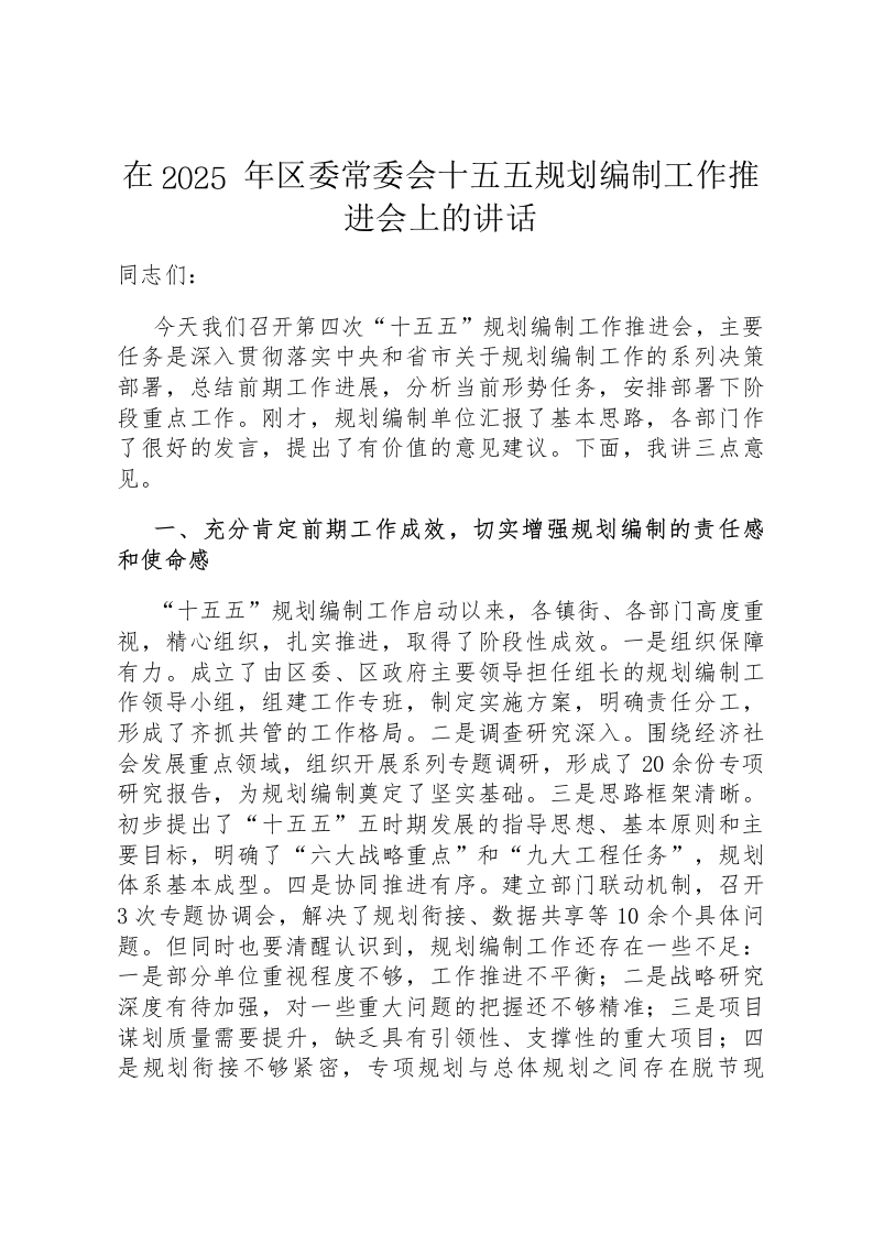 在2025年区委常委会十五五规划编制工作推进会上的讲话