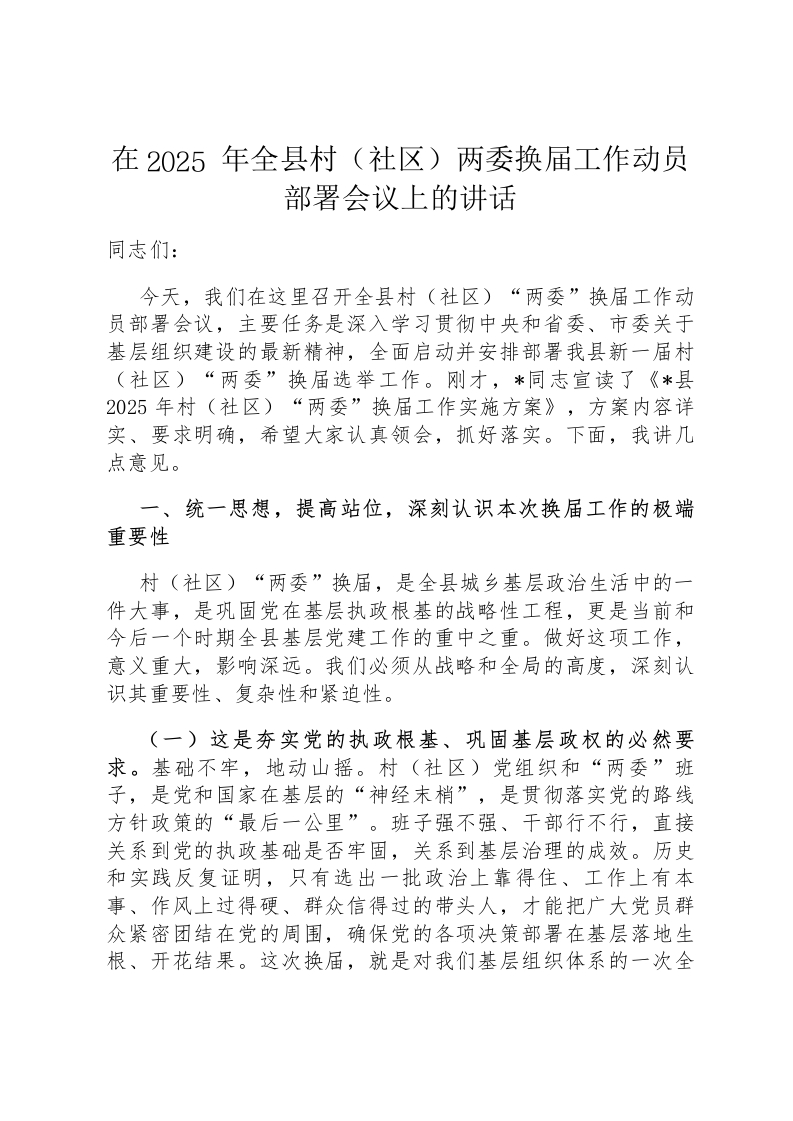 在2025年全县村(社区)两委换届工作动员部署会议上的讲话