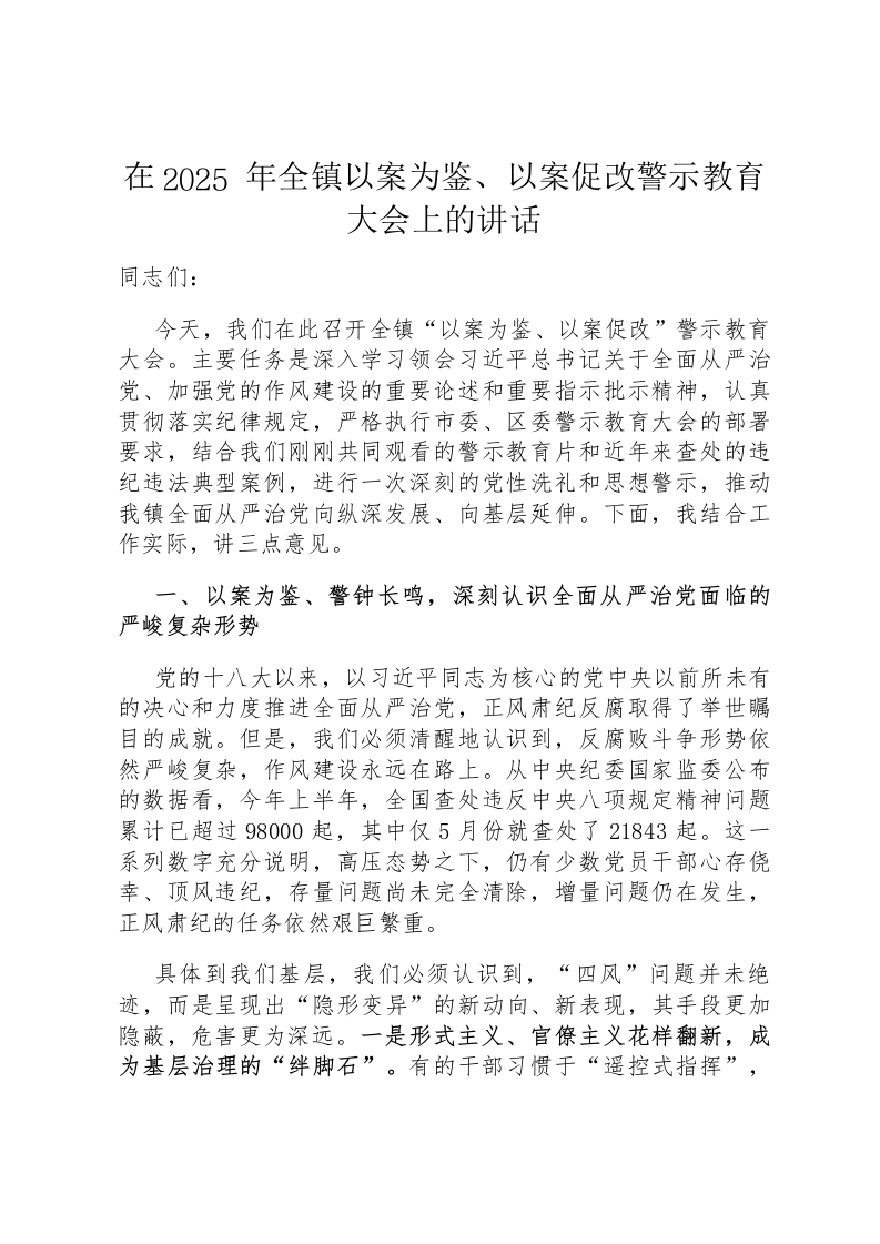 在2025年全镇以案为鉴、以案促改警示教育大会上的讲话