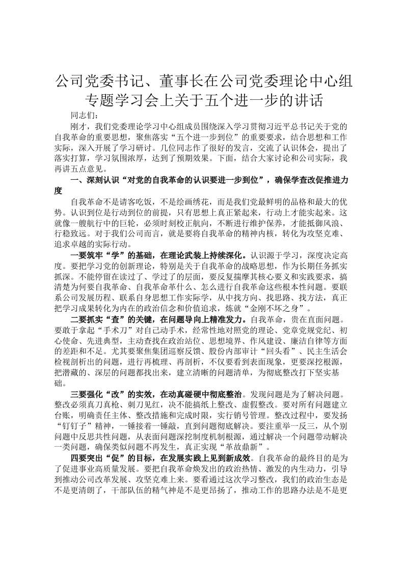 公司党委书记、董事长在公司党委理论中心组专题学习会上关于五个进一步的讲话