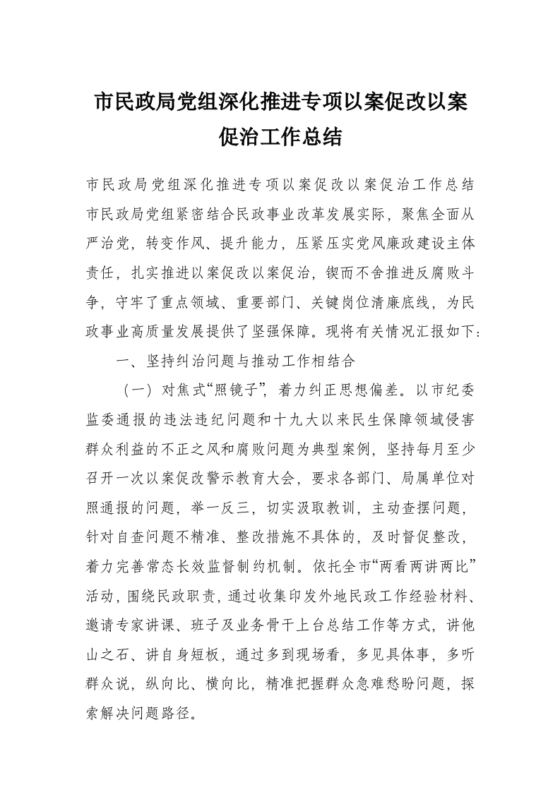市民政局党组深化推进专项以案促改以案促治工作总结