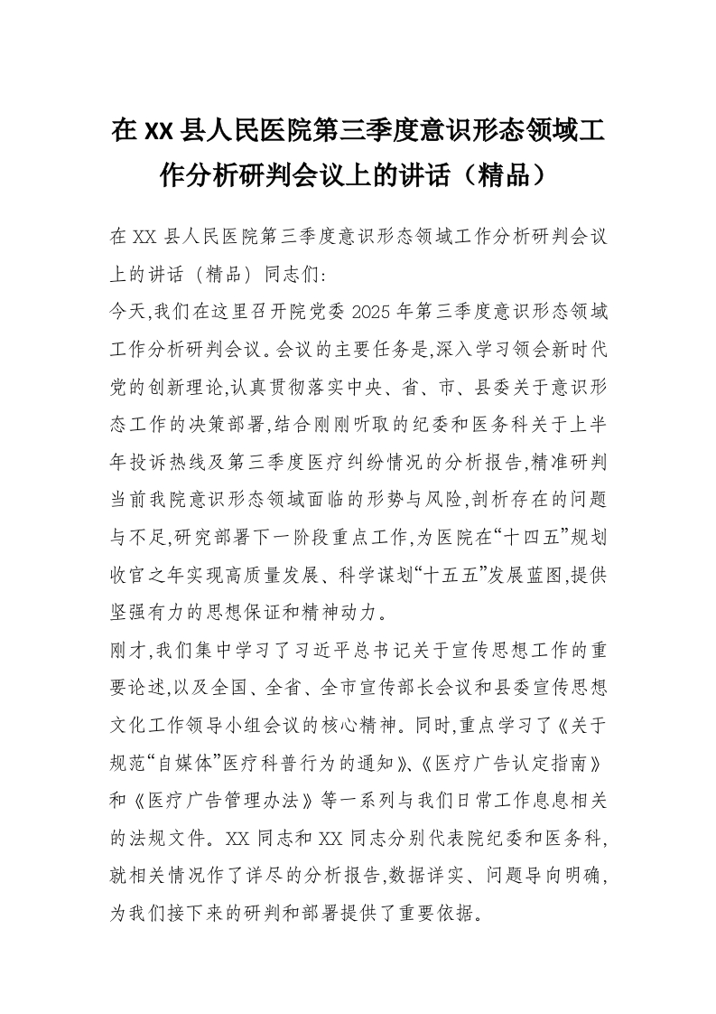 在XX县人民医院第三季度意识形态领域工作分析研判会议上的讲话(精品)