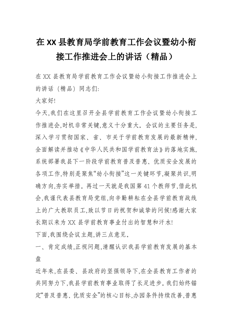 在XX县教育局学前教育工作会议暨幼小衔接工作推进会上的讲话(精品)