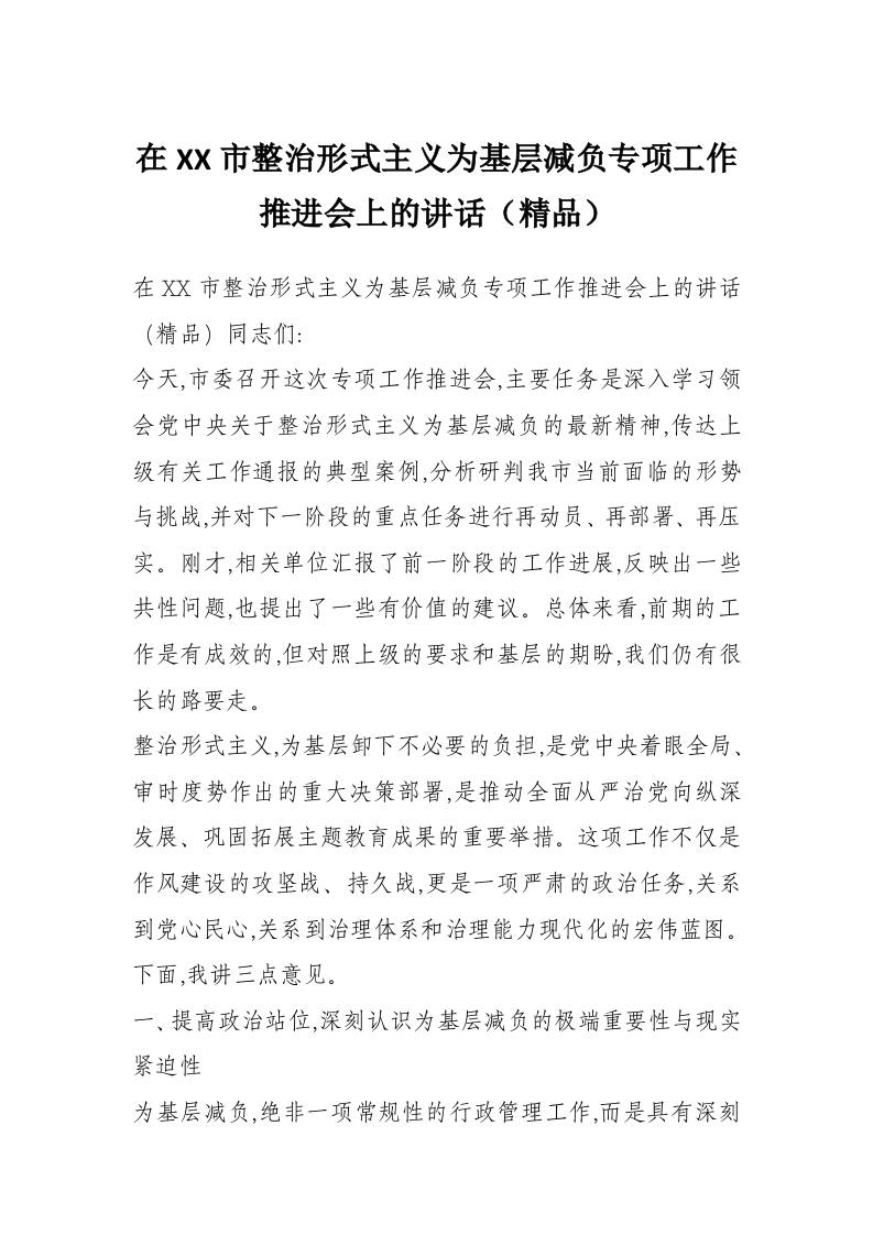 在XX市整治形式主义为基层减负专项工作推进会上的讲话(精品)