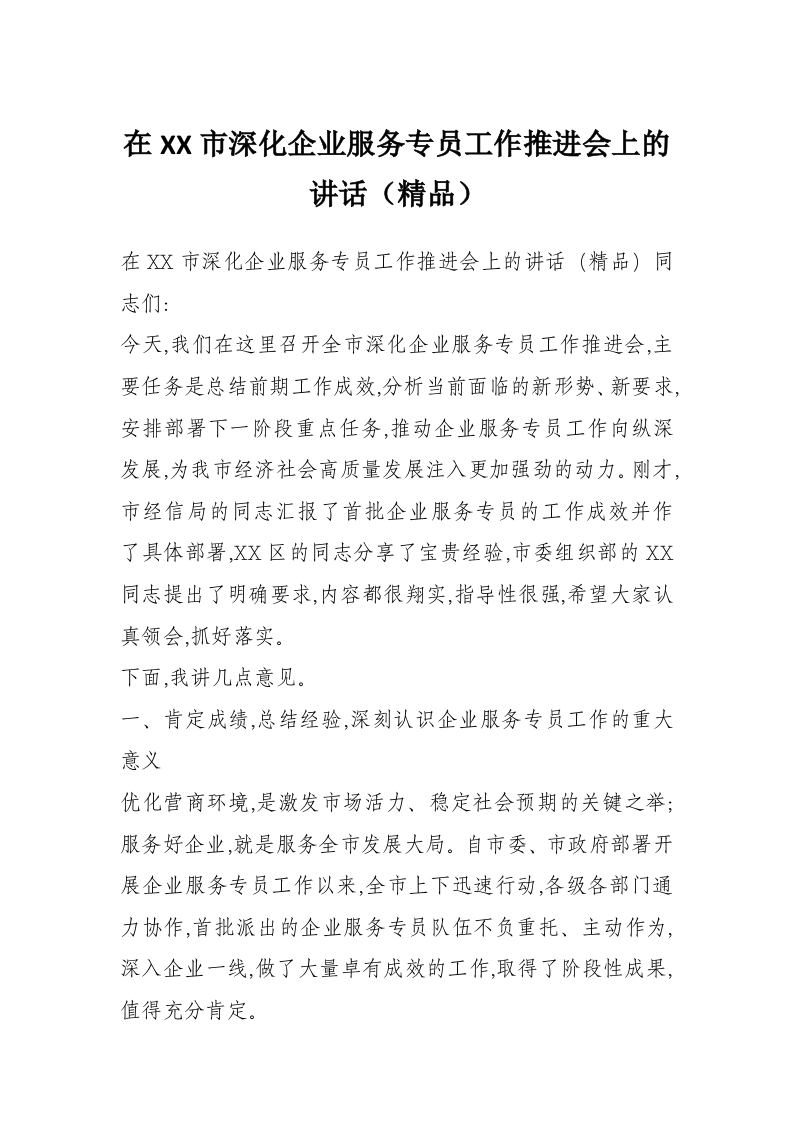 在XX市深化企业服务专员工作推进会上的讲话(精品)