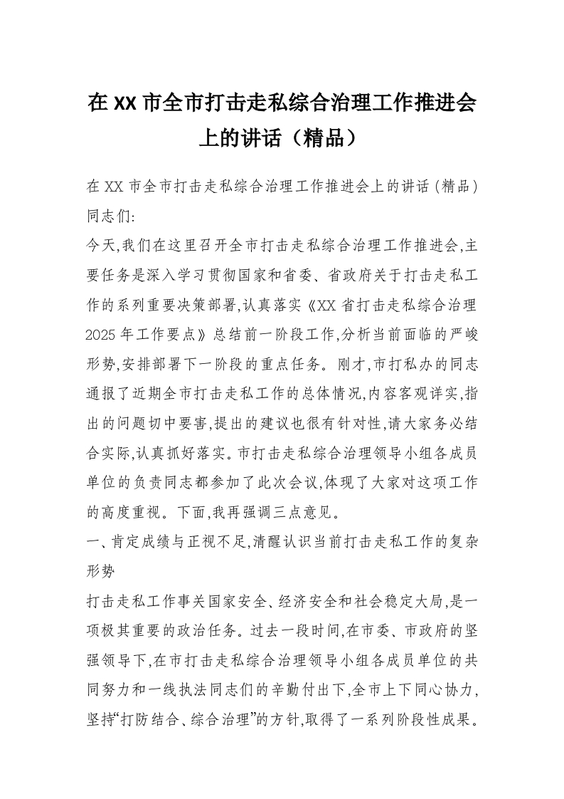 在XX市全市打击走私综合治理工作推进会上的讲话(精品)