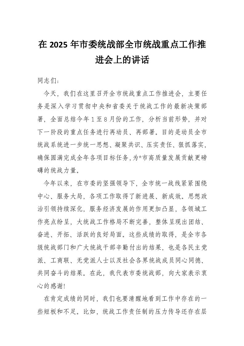 在2025年市委统战部全市统战重点工作推进会上的讲话