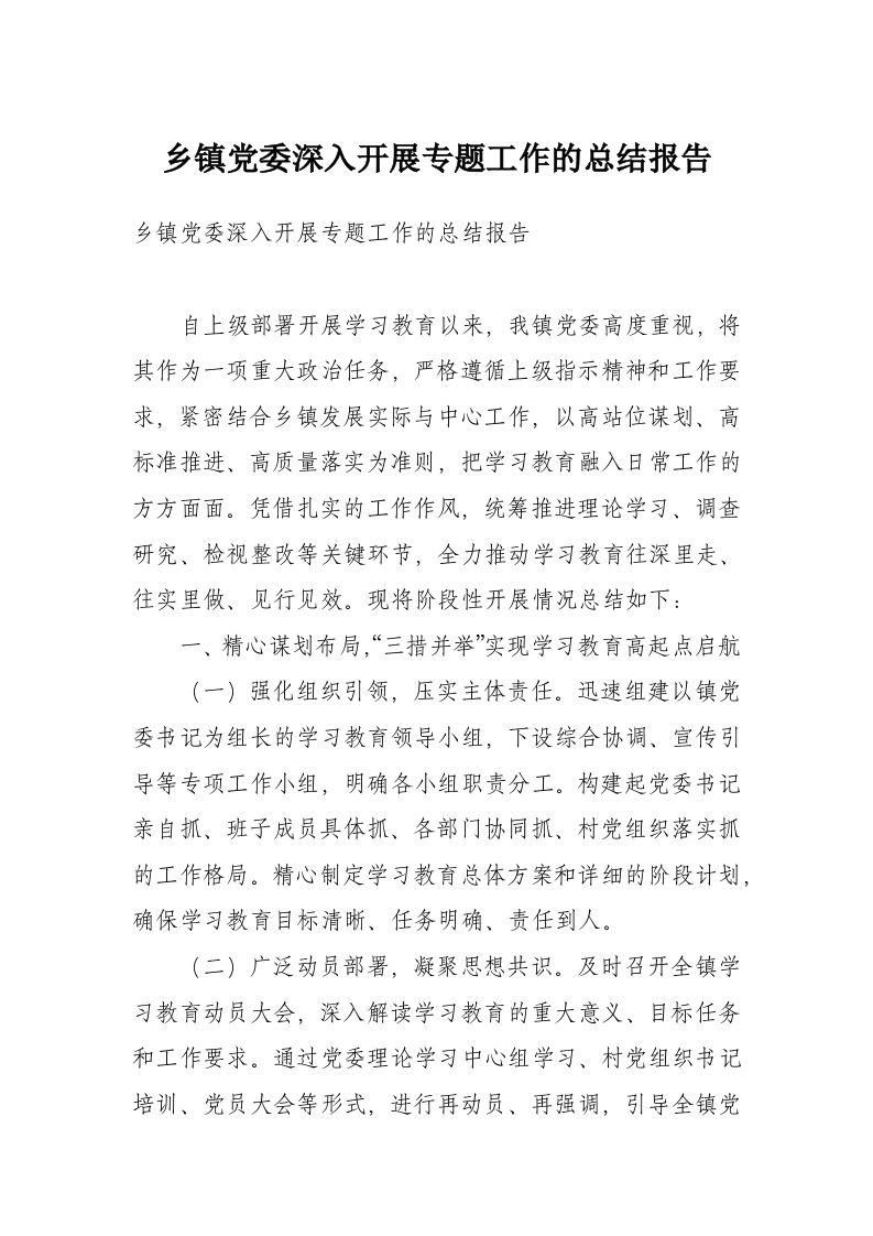 乡镇党委深入开展专题工作的总结报告