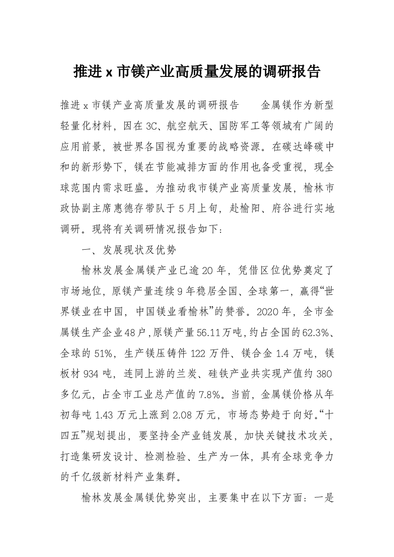 首页材料汇编推进x市镁产业高质量发展的调研报告