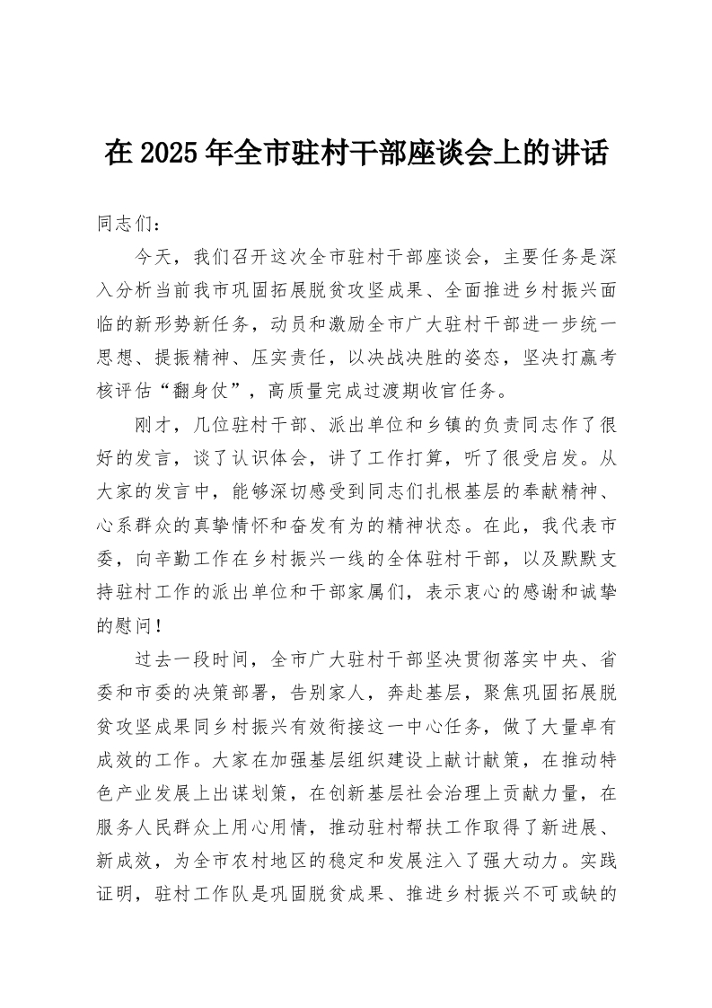 首页写作素材在2025年全市驻村干部座谈会上的讲话