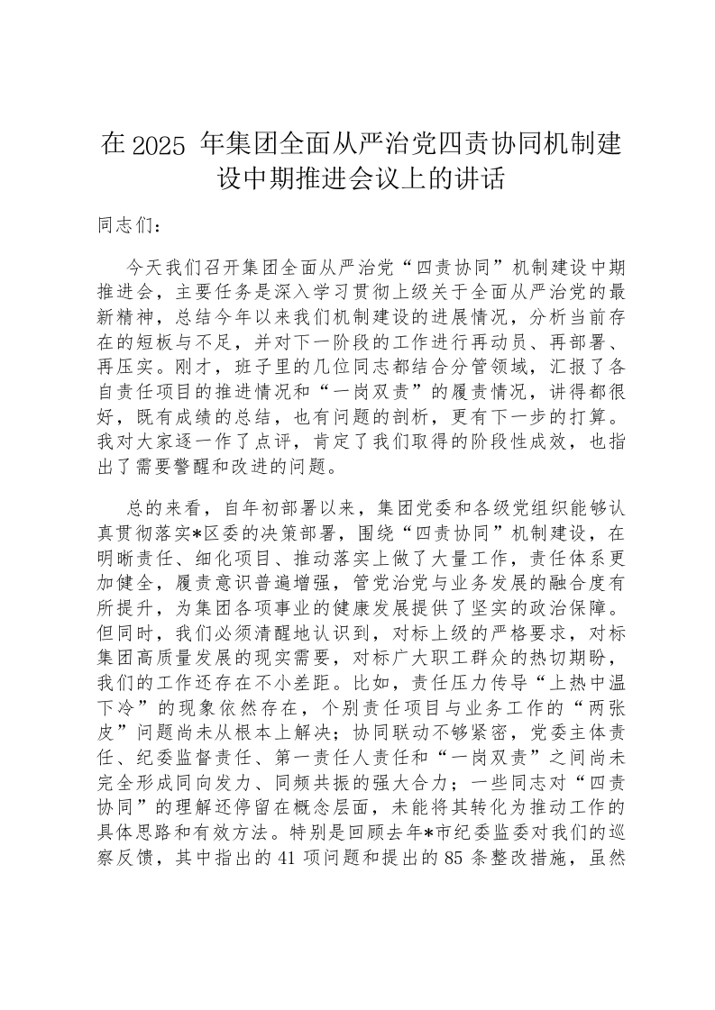 在2025年集团全面从严治党四责协同机制建设中期推进会议上的讲话