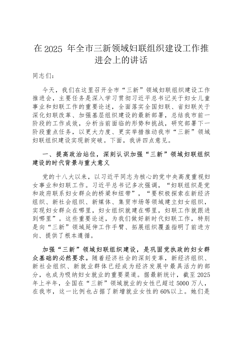 首页写作素材在2025年全市三新领域妇联组织建设工作推进会上的讲话