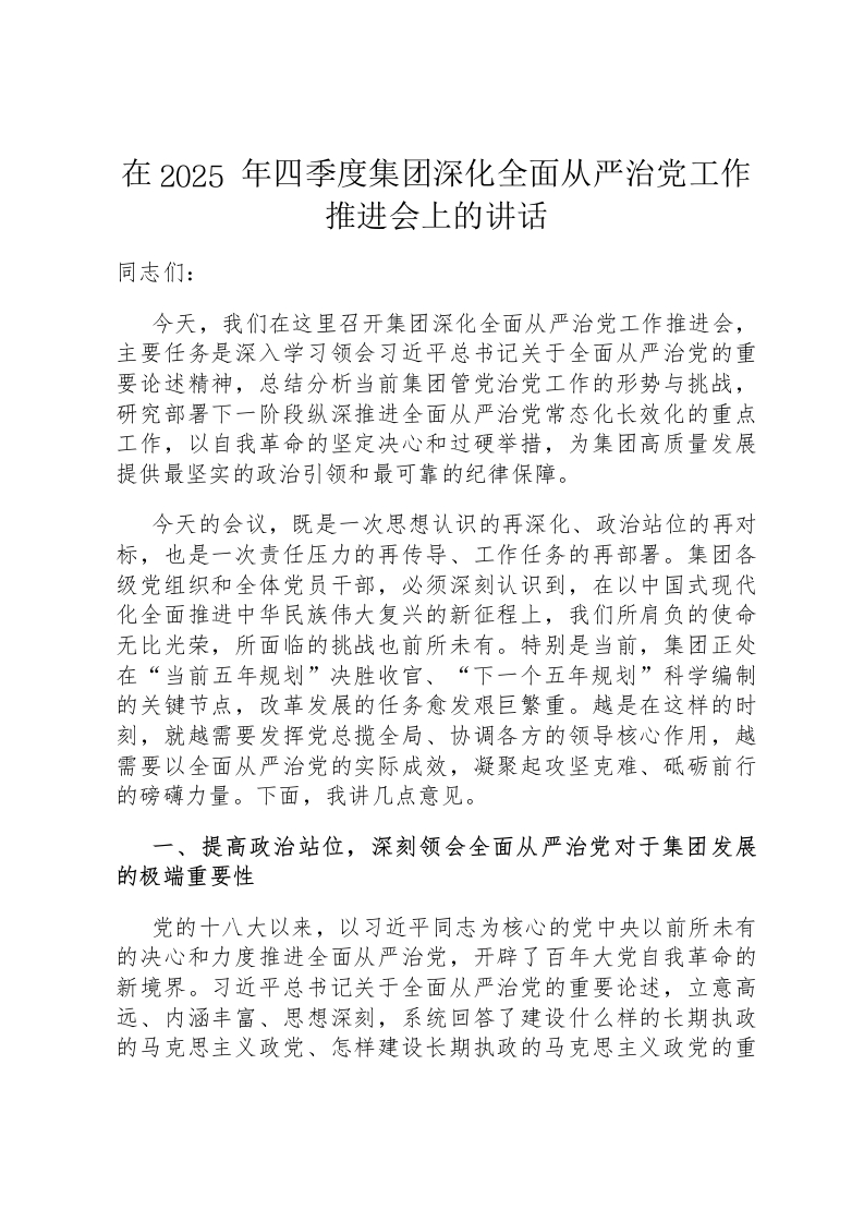 在2025年四季度集团深化全面从严治党工作推进会上的讲话