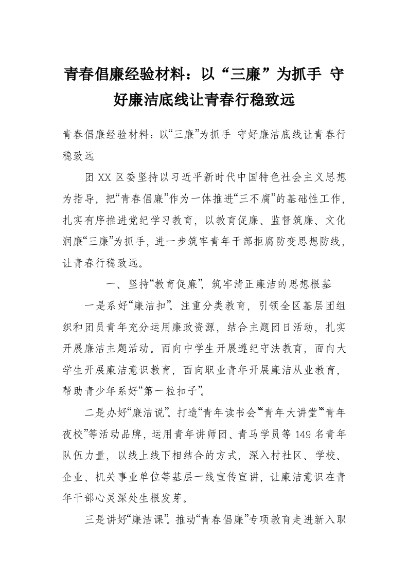青春倡廉经验材料:以“三廉”为抓手 守好廉洁底线让青春行稳致远