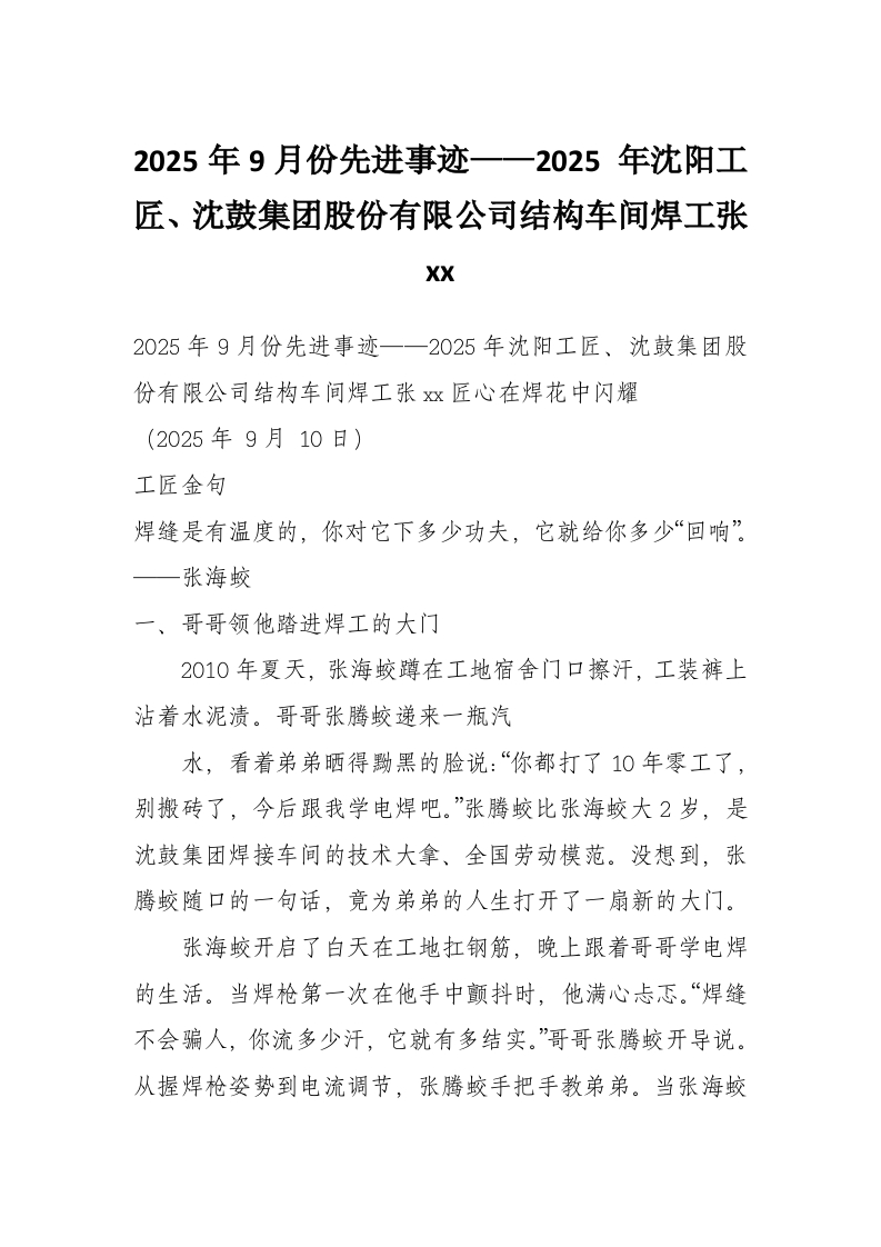 2025年9月份先进事迹——2025 年沈阳工匠、沈鼓集团股份有限公司结构车间焊工张xx