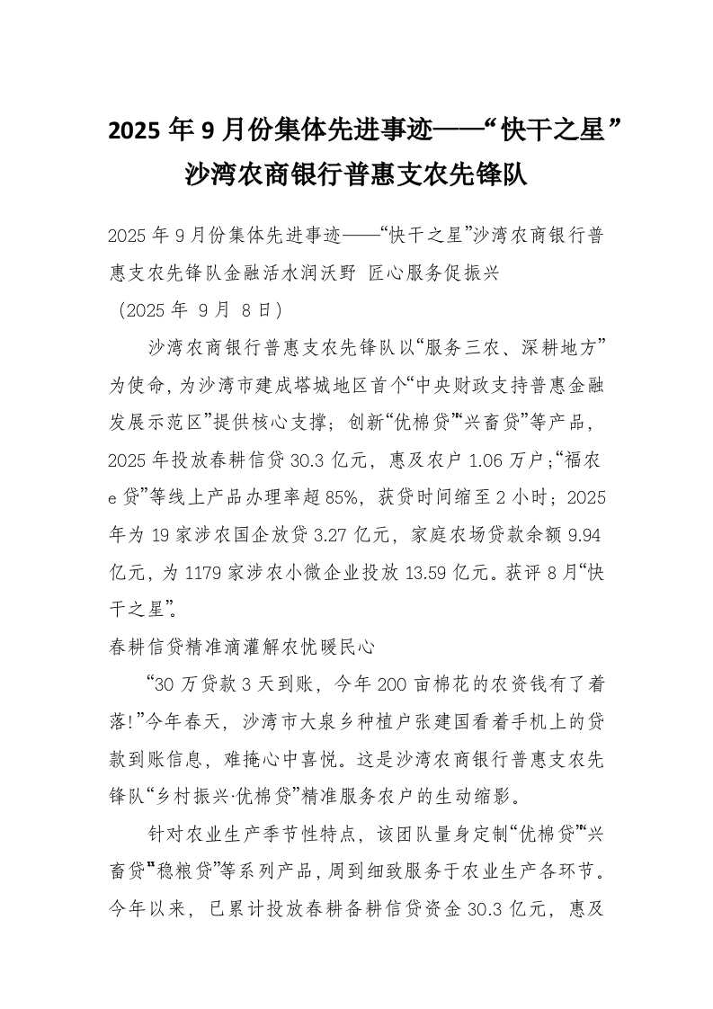 2025年9月份集体先进事迹——“快干之星”沙湾农商银行普惠支农先锋队