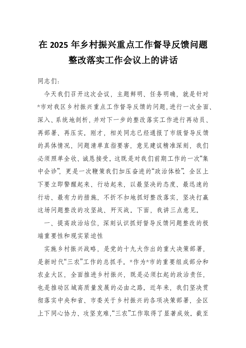 在2025年乡村振兴重点工作督导反馈问题整改落实工作会议上的讲话
