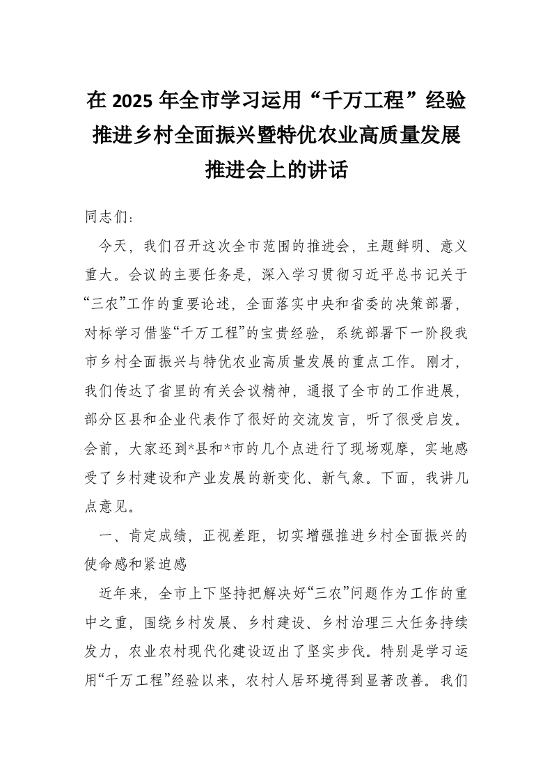 在2025年全市学习运用“千万工程”经验推进乡村全面振兴暨特优农业高质量发展推进会上的讲话