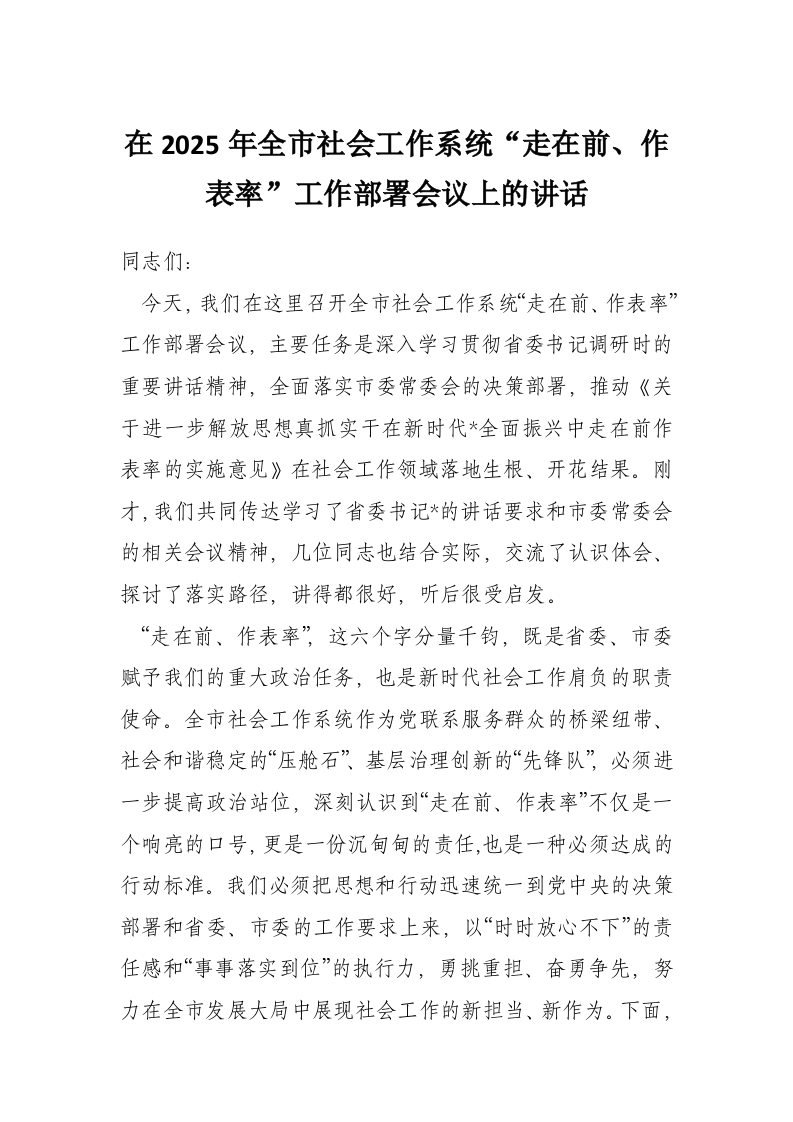 在2025年全市社会工作系统“走在前、作表率”工作部署会议上的讲话