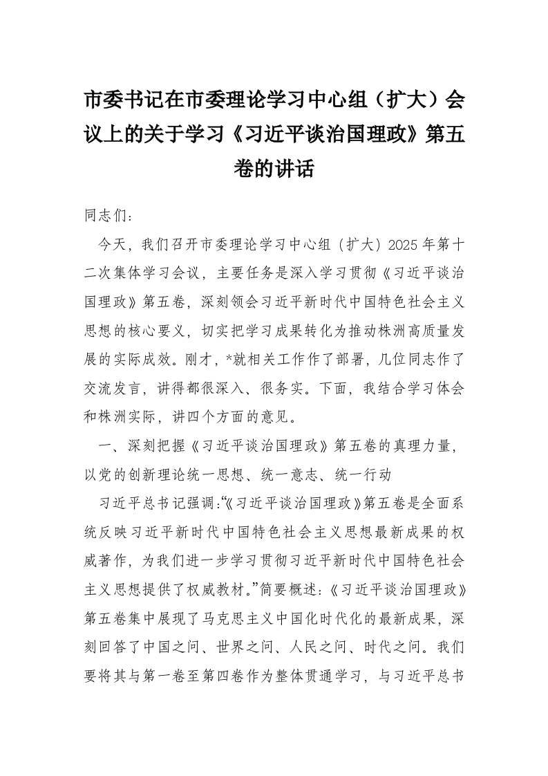 市委书记在市委理论学习中心组(扩大)会议上的关于学习《***谈治国理政》第五卷的讲话