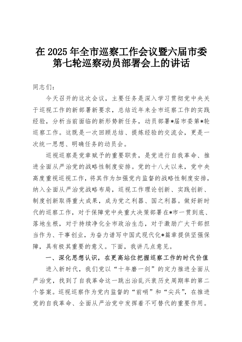 - 在2025年全市巡察工作会议暨六届市委第七轮巡察动员部署会上的讲话