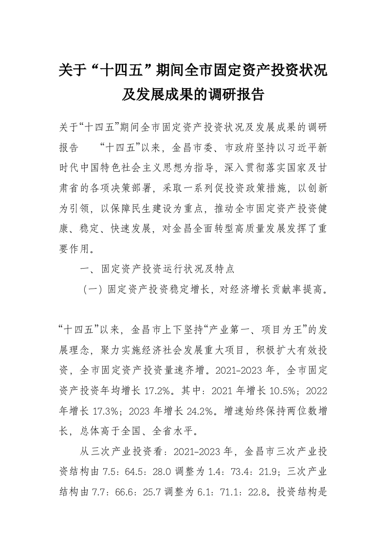 关于“十四五”期间全市固定资产投资状况及发展成果的调研报告