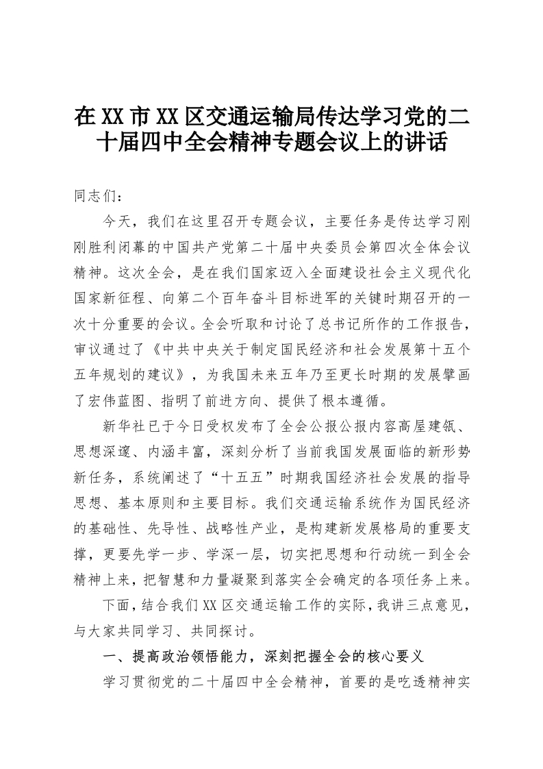 在XX市XX区交通运输局传达学习党的二十届四中全会精神专题会议上的讲话