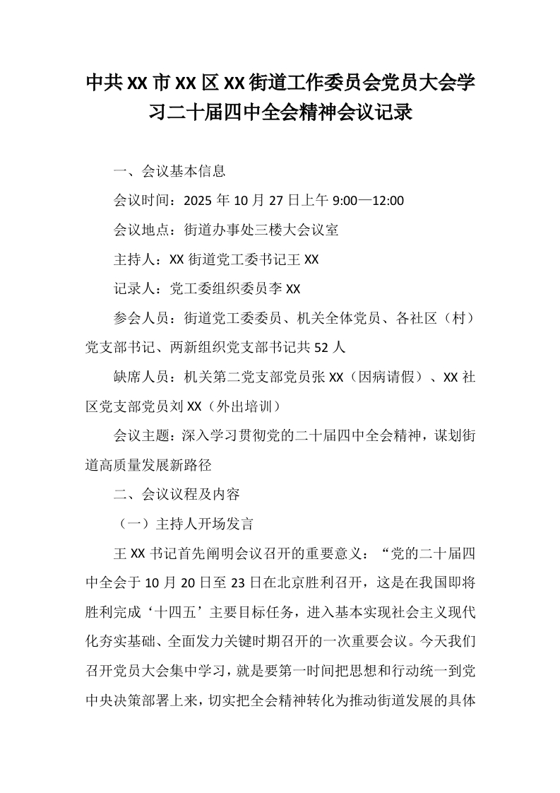 中共XX市XX区XX街道工作委员会党员大会学习二十届四中全会精神会议记录