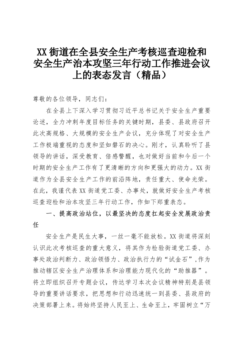XX街道在全县安全生产考核巡查迎检和安全生产治本攻坚三年行动工作推进会议上的表态发言(精品)