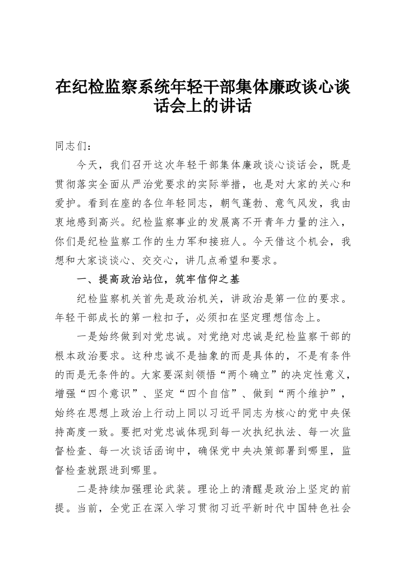 在纪检监察系统年轻干部集体廉政谈心谈话会上的讲话