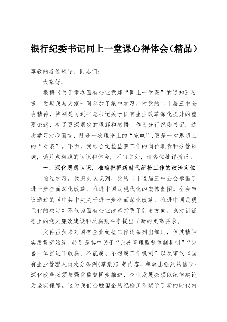 银行纪委书记同上一堂课心得体会(精品)