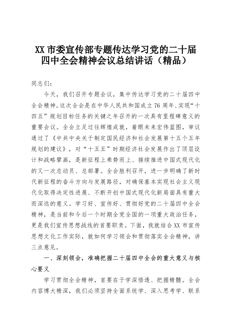 XX市委宣传部专题传达学习党的二十届四中全会精神会议总结讲话(精品)