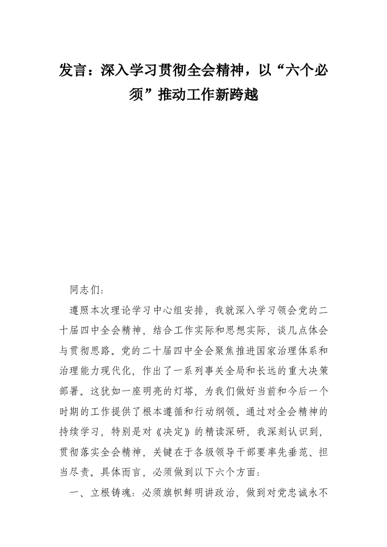 - 发言:深入学习贯彻全会精神,以六个必须推动工作新跨越