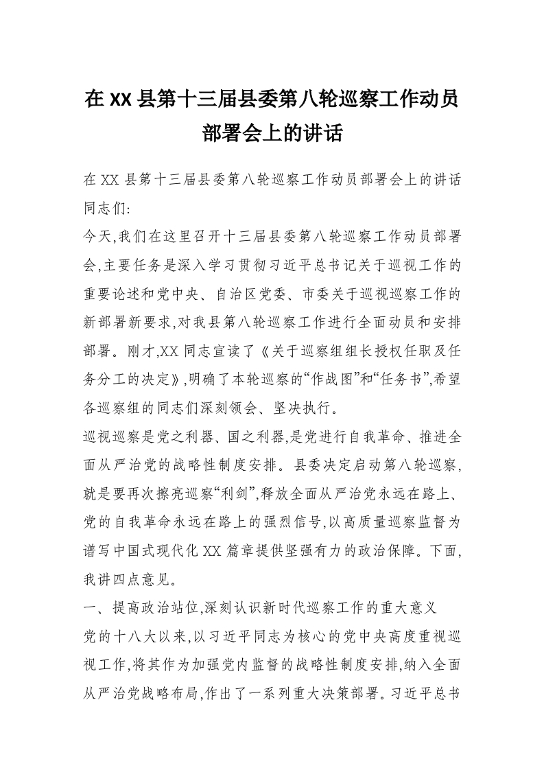 在XX县第十三届县委第八轮巡察工作动员部署会上的讲话